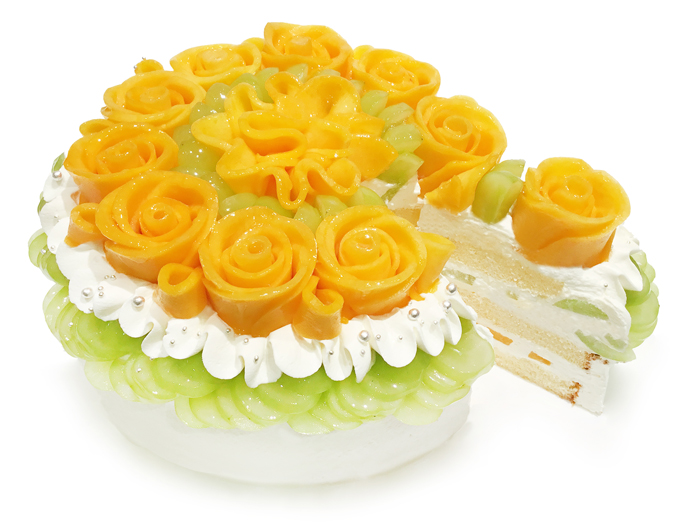 マンゴーで咲かせた美しいバラと、山形県大野農園産「シャインマスカット」、生クリーム、スポンジをあわせて