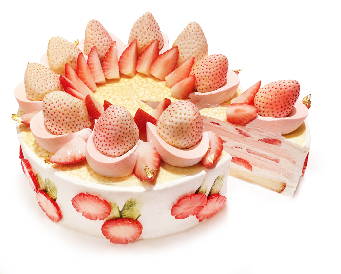 とても希少な白いちごを使用し、赤いいちご、ストロベリークリームと合わせて飾り付けました。
