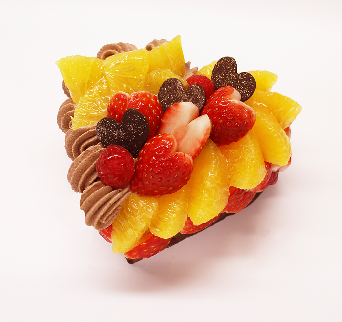 甘酸っぱいいちごとオレンジを、チョコレートクリーム、ハート型のチョコレートとあわせて飾り付けました。