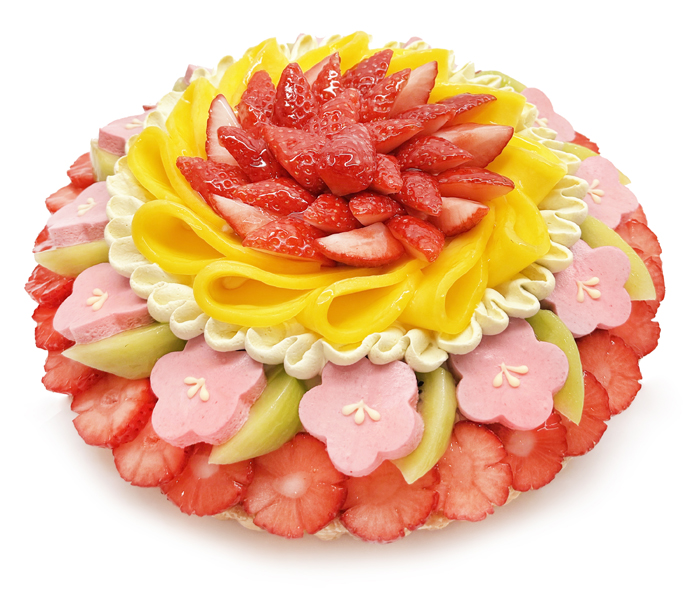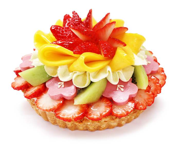 甘酸っぱいいちご、マンゴー、キウイを、ピスタチオクリームとあわせて飾り付けました。