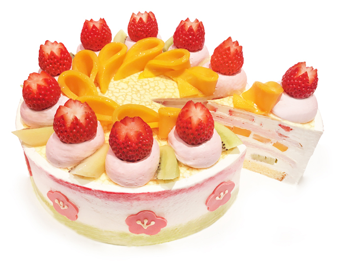 側面に3色のクリームでひし餅を表現し、桃の花を飾り付けた華やかで可愛らしい